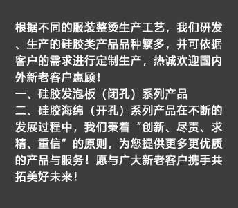 ????我公司生產(chǎn)的硅膠海綿具有耐高溫、耐壓、透氣性能好、抗撕拉、使用壽命長(zhǎng)、環(huán)保等特點(diǎn),主要適用于服裝干洗、水洗熨燙設(shè)備,如壓燙機(jī)和燙臺(tái)等。另外我們也提供各種燙氈、罩布等整燙專用墊料,客戶可根據(jù)不同熨燙工藝選擇不同的搭配組合,滿足高品質(zhì)的熨燙要求。